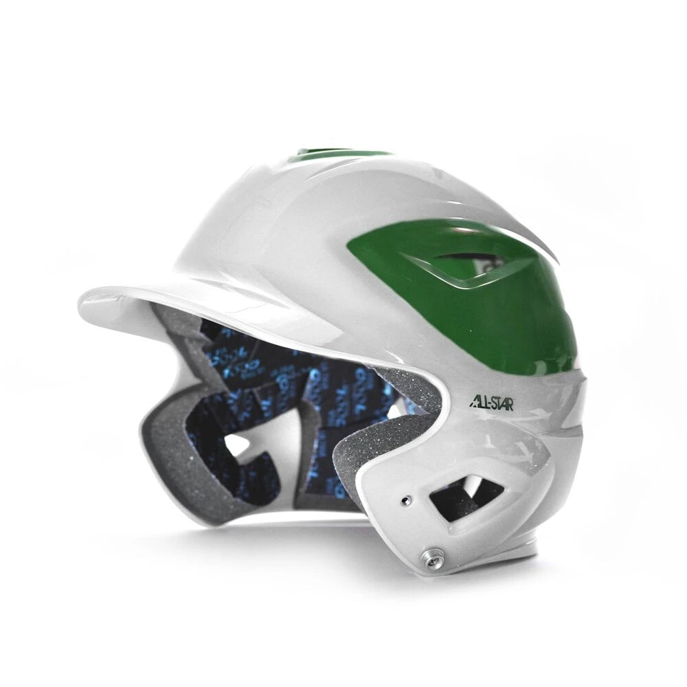 The All Star Osfa Batting Helmet BH3000WTT batting helmet is a one-size-fits-all helmet that is made to protect and provide comfort. All Star is one of the top producers of baseball equipment and this Osfa Batting Helmet represents just that. The sleek two-tone outer shell is comprised of strong, impact-resistant ABS plastic, and is well-ventilated to keep batters cool. The inside contains a moisture-absorbing Ultra-Cool lining system, enhanced with the antibacterial AEGIS Microbe Shield. When stepping to the plate you will feel protected and confident which will help you to get the upper hand on the pitcher.
